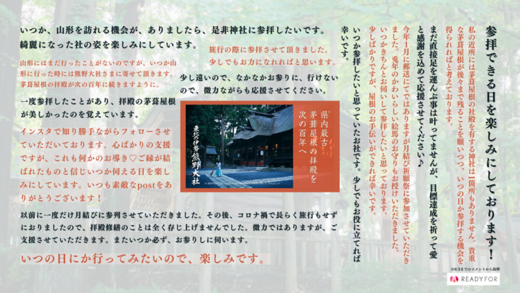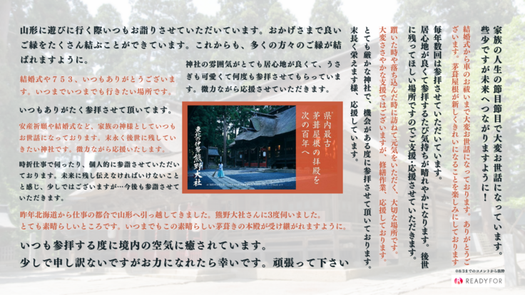 地域を問わず、遠方の方やサイトを通じて熊野大社を知ってくださった方など、本当に多くの方々から、あたたかいご支援と励ましをいただきました。このプロジェクトを通して、ご支援はもとより、皆さまとの繋がりや、あたたかな応援の声をいただき、その一つひとつが、本当に有難く、次の世代に繋げていく原動力となっております。心よりお礼申し上げます。