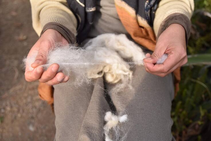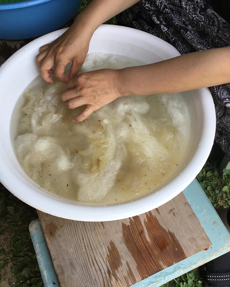 我が家で飼っている羊の毛は、お湯で洗っています。私たちが暮らしているところは山と川が近くにあり、自然がとても身近にあります。暮らし以上の廃液は出したくない、という想いでお湯洗い、または少しの石鹸水で洗います。