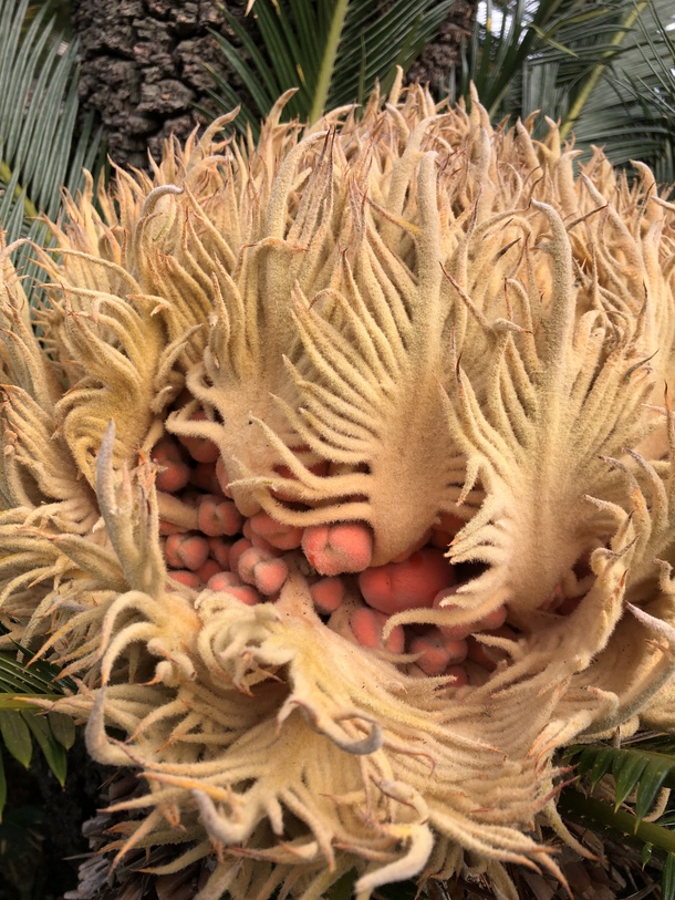 庭の樹齢600年の蘇鉄の中に、今年も柔らかな実が育っています。