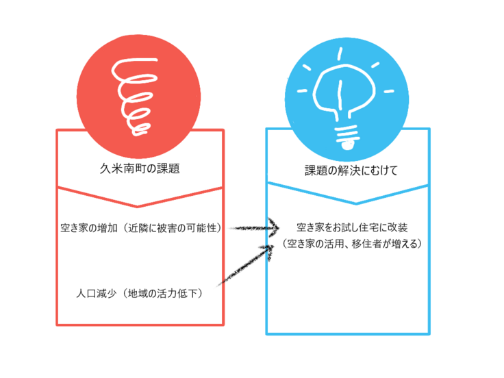日本全国で人口減少が進む中、久米南町も例外ではありません。町としてこの問題に対して移住定住支援をおこなっています。具体的には東京や大阪等の移住相談会で、移住・定住希望者の方と話をして、久米南町に住みたいという希望の実現のため、空き家バンクを紹介しています。しかし「移住したいけど、いきなりはちょっと・・・」「移住前に実際に地域を見学したいけど、何度も往復するのは大変」と不安を感じている方も多い現状です。そこでそのような不安を少しでも解消していただくため、久米南町に実際に一定期間暮らすことで、地域の文化や生活環境を体験しながら移住を検討できる「お試し住宅」があればいいのではと考えました。お試し住宅に住んでみることで、地域の魅力を体験でき、移住後の地域とのミスマッチのリスクも減らすことができます。