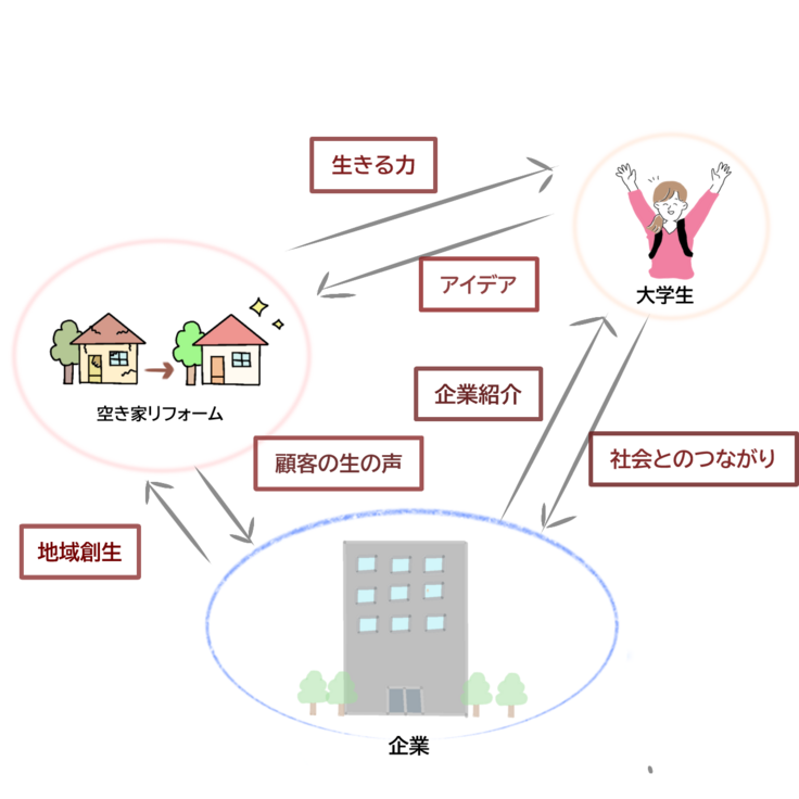 地域創生に積極的な企業と連携を図り地域活性化を目指します。地域創生は企業にとって、顧客の生の声を聞くきっかけになり、大学生とのつながりの中で企業についてよく知ってもらい、優秀な人材を採用する機会にもなります。大学生にとっても社会に出る前に、自身のキャリアについて考えることのできる場になります。