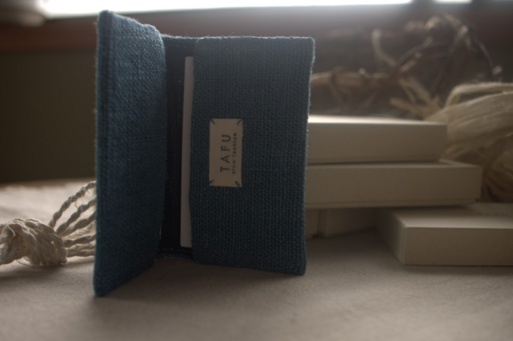 太布(たふ)は、楮の繊維を手作業で糸にして織り上げる、日本最古の織物のひとつ。縄文時代にまで起源を遡るといわれます。かつては日本各地で作られていましたが、いま技術が残るのは徳島西部のごく限られた地域だけ。一つの名刺入れに使う糸をよるのにかかるのが約10時間。その後、職人が丁寧に織り、縫い上げて、手で藍染めをして完成します。
