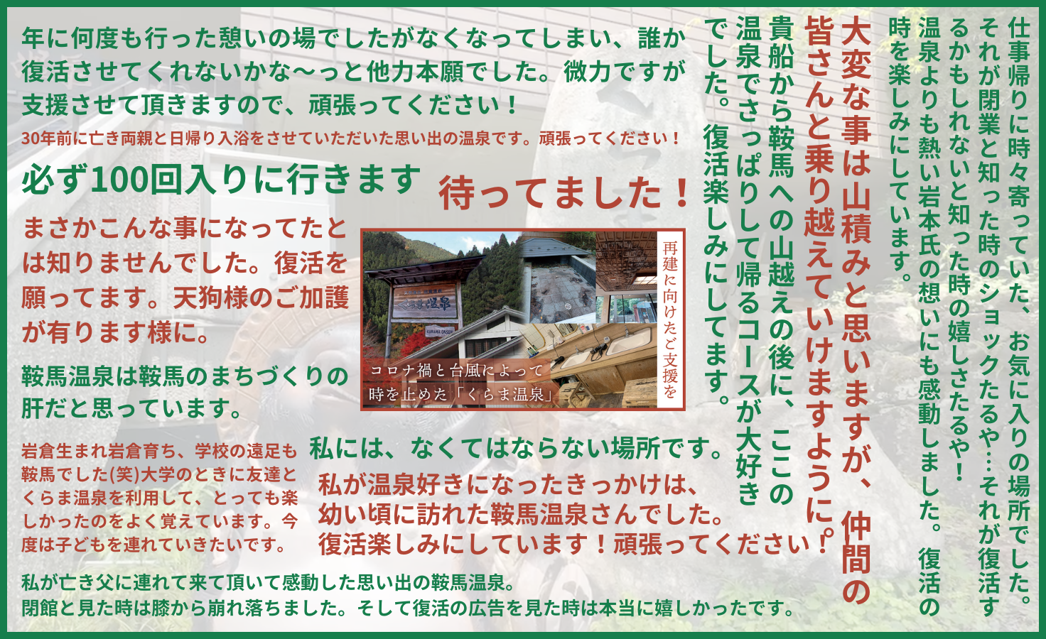 実はこちらに入り切らないコメントの中には、海外からくらま温泉の再建を願ってくださっている方もいらっしゃいました。