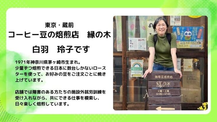 これらの問いに対する一つの答えが、珈琲焙煎と、全国の福祉事業所のお菓子をコラボする「縁の木」の設立でした。