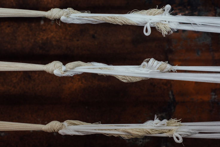 光のなかできらめく糸、機場の床に散る小さな綿のかたまり、壁に残された覚え書きのメモ、職人がたゆまず動かす手先。