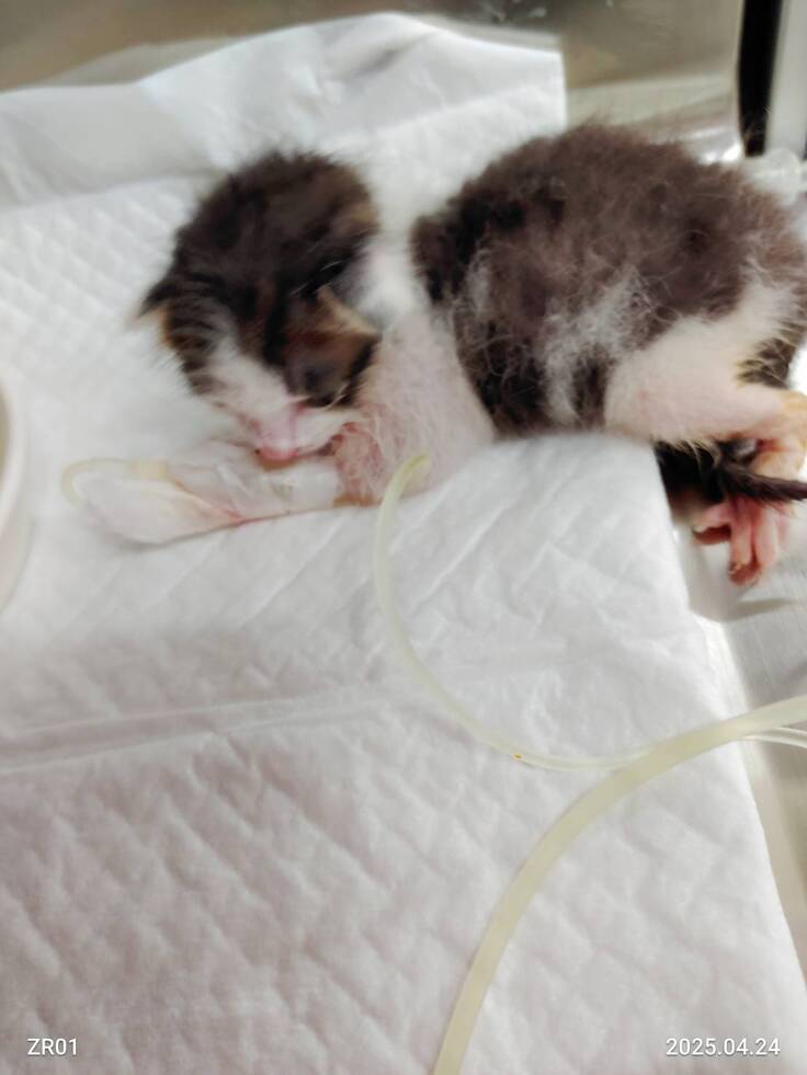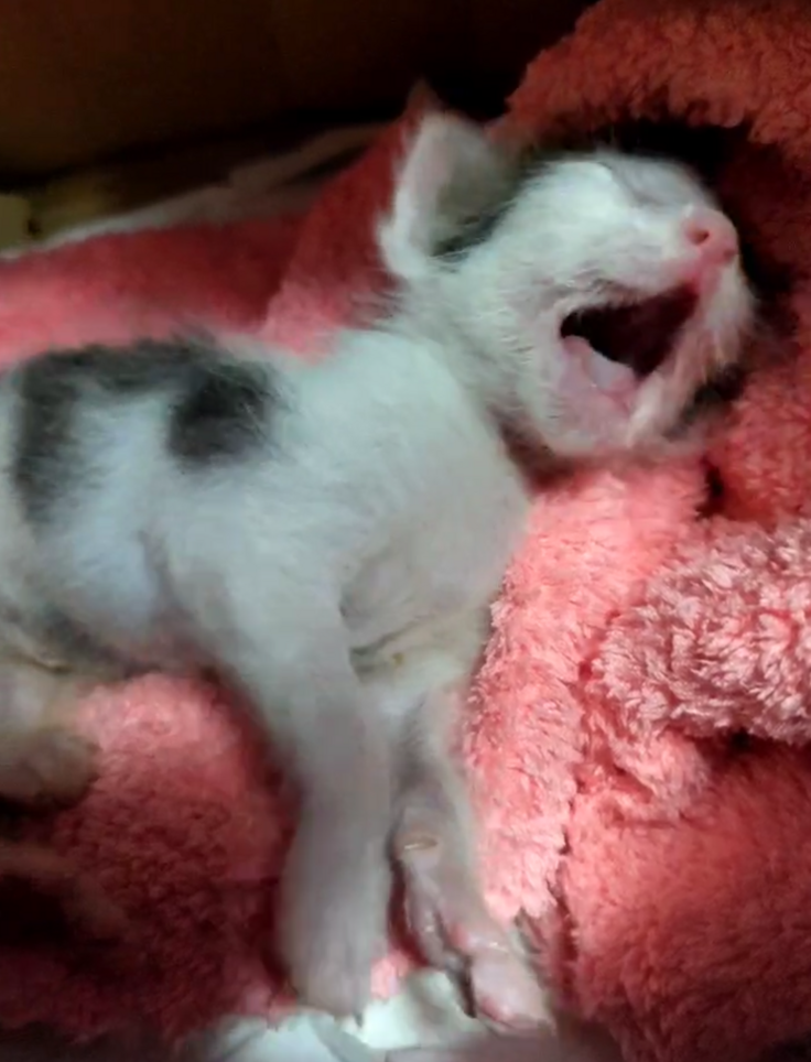 キジ白、黒白兄弟は5匹で保護されましたが、うち2匹はあっという間に天国へ逝ってしまいました。残りの3匹のうちの1匹が今入院をしています。名前は“ペロくん”。ミルクの後にお口をペロペロする姿がとても可愛くて、ミルボラさんに名付けてもらいました。