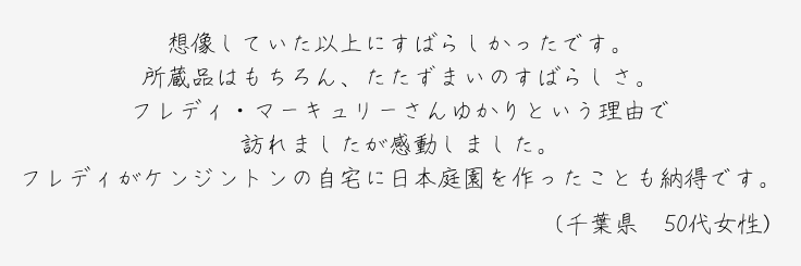 また、地域の皆さまと連携し、芸術・文化活動の場を提供するとともに、各種イベントを開催し、文化・観光・経済活動を通じた地域振興と発展にも努めています。1986年には、フレディ・マーキュリーが当館を訪れ、その後、映画公開をきっかけに多くのファンの方々が来館され、「フレディが愛した日本文化の聖地」として、ファンとの交流やイベントも行っております。