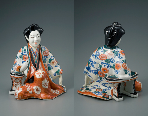 脇息に右ひじを預け、左足を立てひざにして座す婦人像です。柿右衛門様式の婦人像は立ち姿で表現されることが多く、座した姿の伝世品はそれほど多くありません。