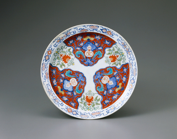 高台内に「元禄八乙亥 柿」の銘を有する皿です。同様の銘は、この他に六年、十二年が知られており、これらの一群は「元禄柿」と称されています。透明感のある素地は歪みなく整い、三方に濃厚で美しい赤地唐花文、間を繋ぐ軽やかな花唐草文、口縁には宝文が描かれます。