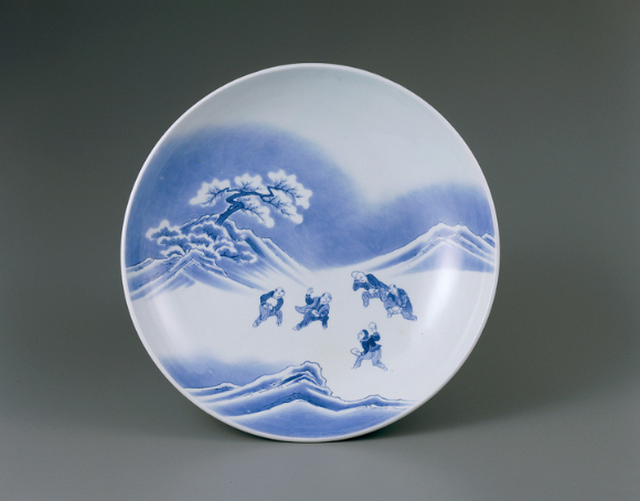 蛇の目状の高台に、葉をかたどった三足が付く大皿です。この形状は最盛期鍋島のみに見られるもので、同様の器形の幾つかの作品は重要文化財に指定されています。器形に劣らず類例のない意匠や、それを表現する染付技術が極めて秀逸です。樹木に積もった雪、山容と雪景の対比、雪に足を埋めながらも戯れる童子など、染付の濃淡と確かな描線で静寂の中に躍動する光景を出現させました。