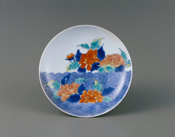 墨弾(すみはじ)きという鍋島にはよく用いられる白抜き技法により、均一な青海波文様が表現された七寸皿です。この青海波で器面を上下に二分し、それぞれに大輪の牡丹が配されます。