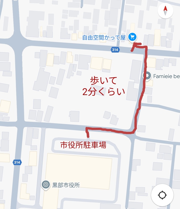 かって屋さんには、駐車場がありません。近くに黒部市役所がありますので、そこの駐車場から歩いてお越しください。