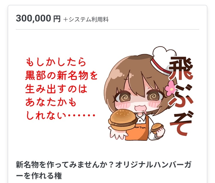 さて、ご用意しているご支援プランの中で最も支援額の大きいのは「オリジナルバーガーを作れる権」でございます。ほぼネタ枠で用意したものでしたが、本日こちらにご支援をいただくことができました。