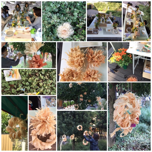 四角い陶器の器にくるくるkenzanとお花を飾りデザインし、残りの時間でかんなくずの廃材を使ってリースを作ったりボンボンを作ったり皆さん自由自在に楽しんでおられました。横にある木にかけてまるで北欧のクリスマスオーナメントのようにも仕上がってお好きな場所で屋外撮影も楽しまれたようです。捨てるものがこんな形で可愛いものに変身する喜びを皆で一緒に感動していただいたことに嬉しく思います。