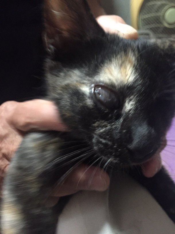 車が沢山通る道路の真ん中でうずくまっているところ、「危ない」と思わず車を止め、拾い上げたところ、片目が白く飛び出し、痛々しく悲惨な状況に思わず目を背け、のけぞる位の形相だったそうです。それでもこの子ヘレンは暴れるだけの力は残っていました。それから保護、緊急手術で片目の摘出をしました。