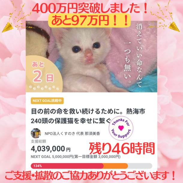 プロジェクト終了まで、残り46時間となりましたが、ネクストゴール達成を信じ、最後まで諦めずに保護猫達のため全力で完走を目指します!