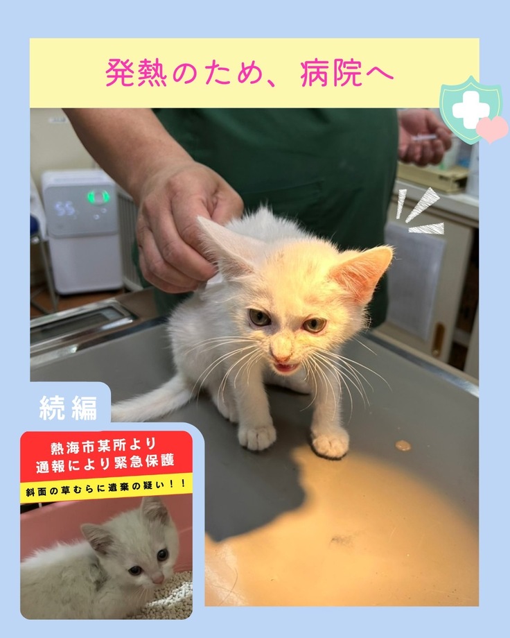 先日、熱海市内で土木工事の方からの通報により保護した子猫が、