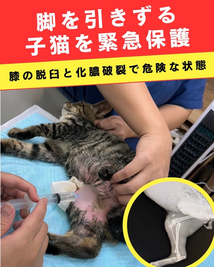 仔猫の状態から、直ぐに引取りを行い病院を受診したところ骨折では無く、酷い脱臼により膝のお皿までもすっ飛び、腱も切れてしまっていることが判明!