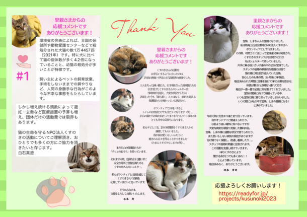 保護猫達に医療をかけ、第二の猫生となる幸せに繋いでいきたい!という思いで挑戦したプロジェクトが成功となるようどうか最後までくすのきの保護猫を応援をくださいますようお願いいたします。