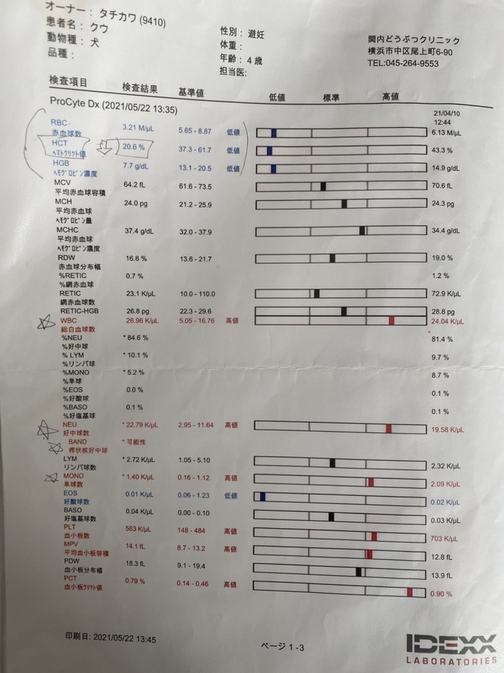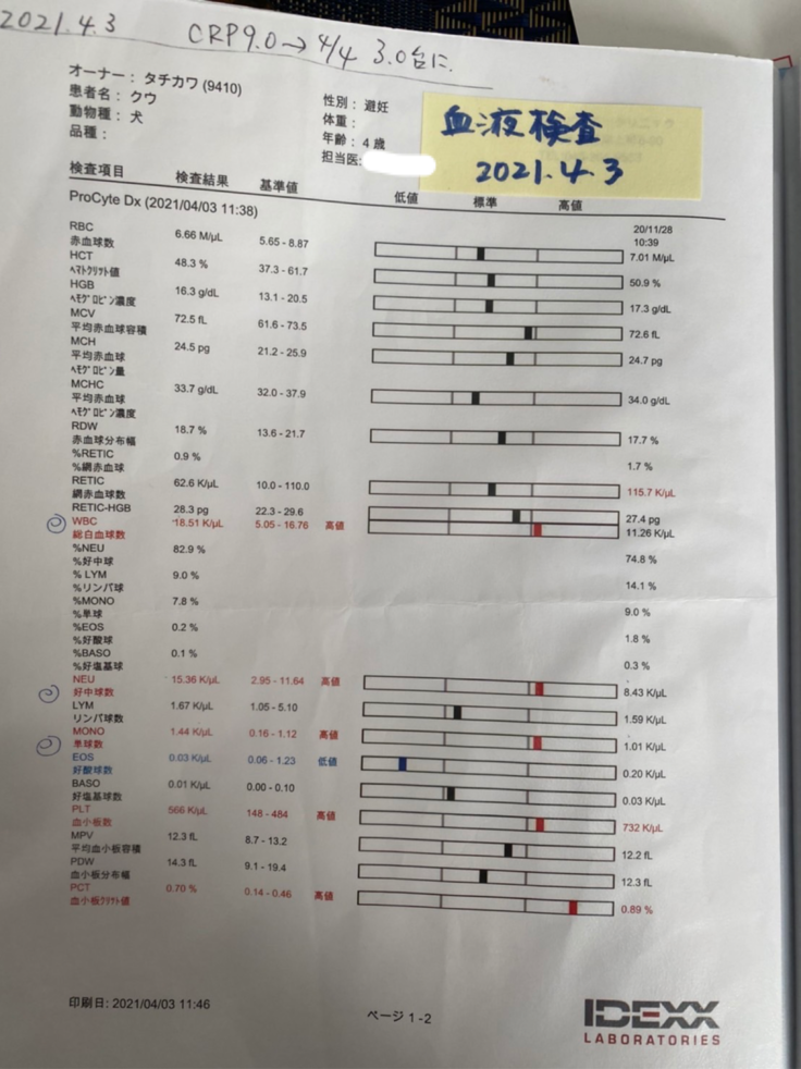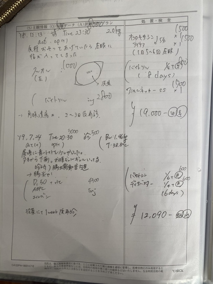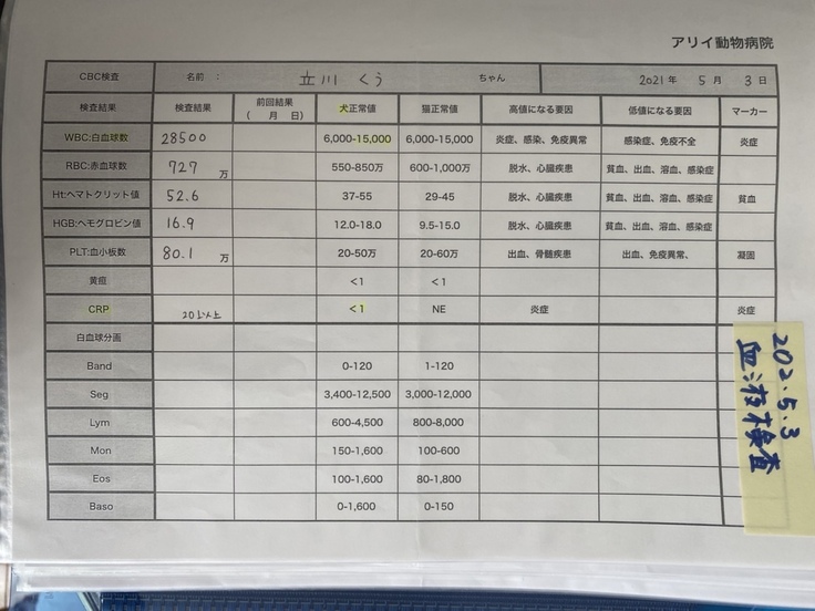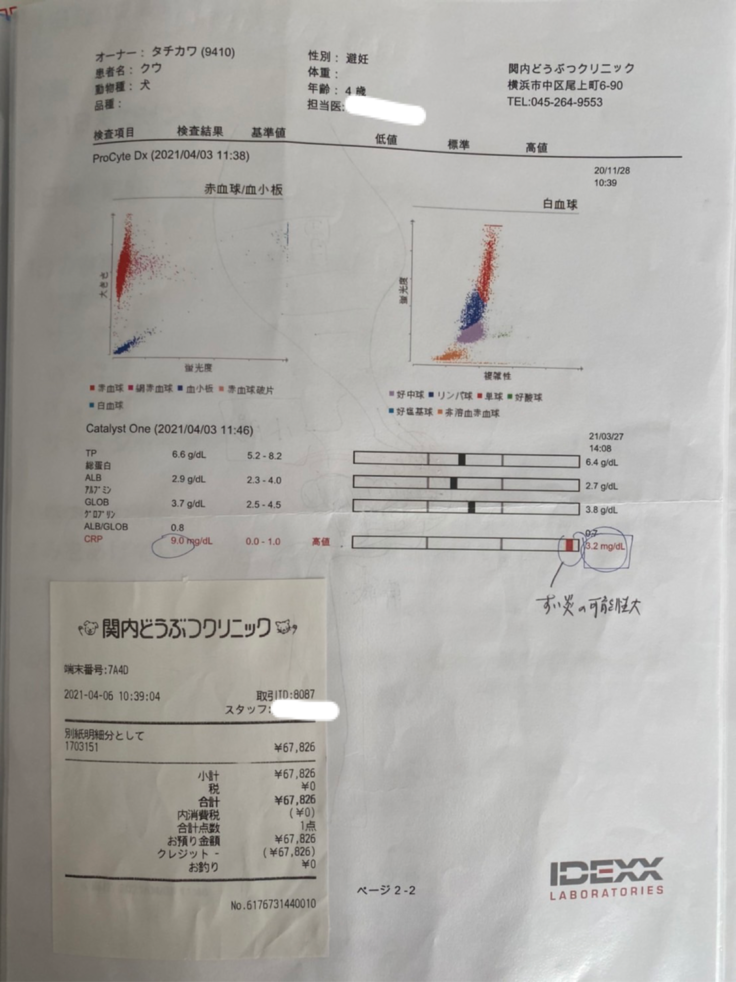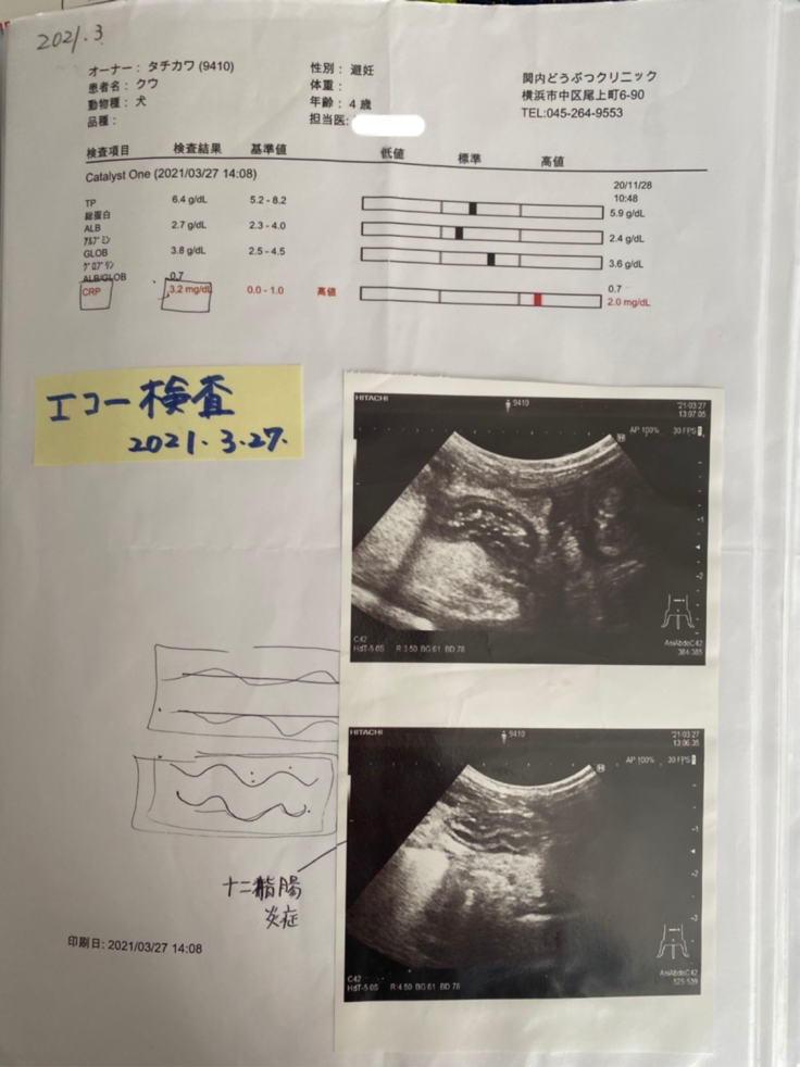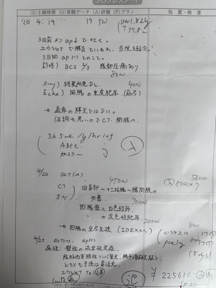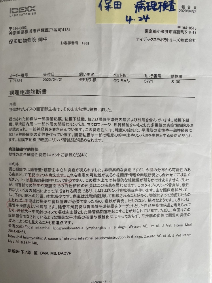 明らかに腸が肥大化しており、臓器に癒着を起こしている。腫瘍の可能性が高いとの見解により、回復手術を行い回盲部を一部切除し、病理検査に出さなければ治療方針も立てられないと言われています。