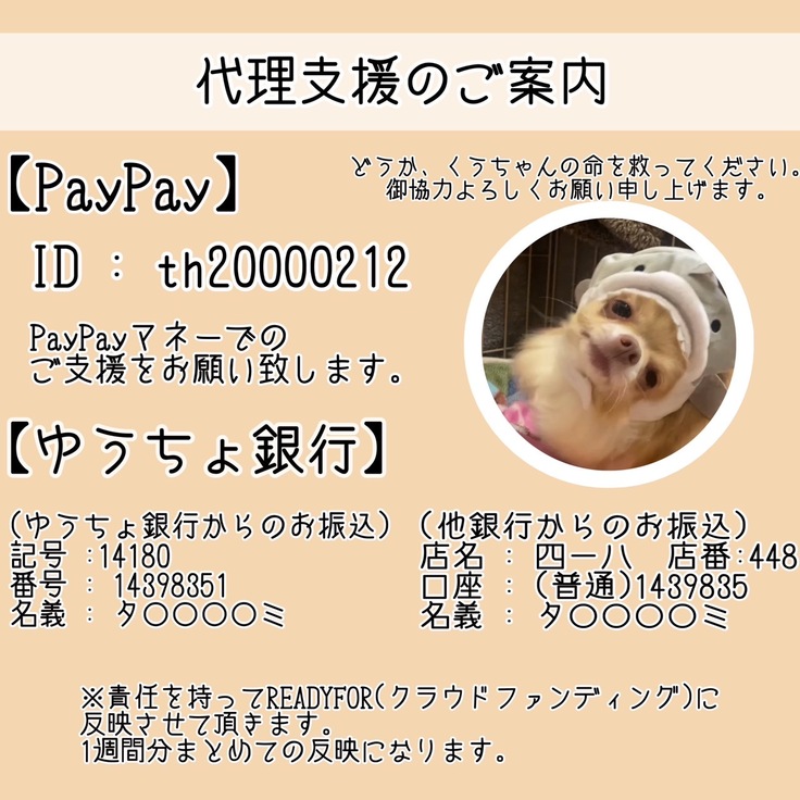ご支援いただいた支援金は、全てくうちゃんの心臓病の手術代と入院費に大切に使わせていただきます。