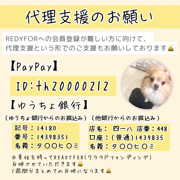 ご支援いただいた支援金は、全てくうちゃんの心臓病の手術代と入院費に大切に使わせていただきます。