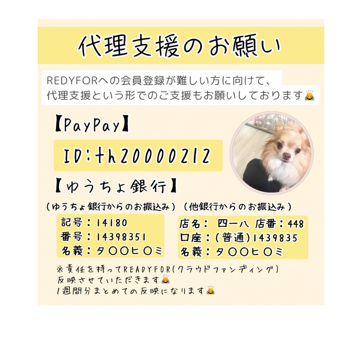 ご支援いただいた支援金は、全てくうちゃんの心臓病の手術代と入院費に大切に使わせていただきます。