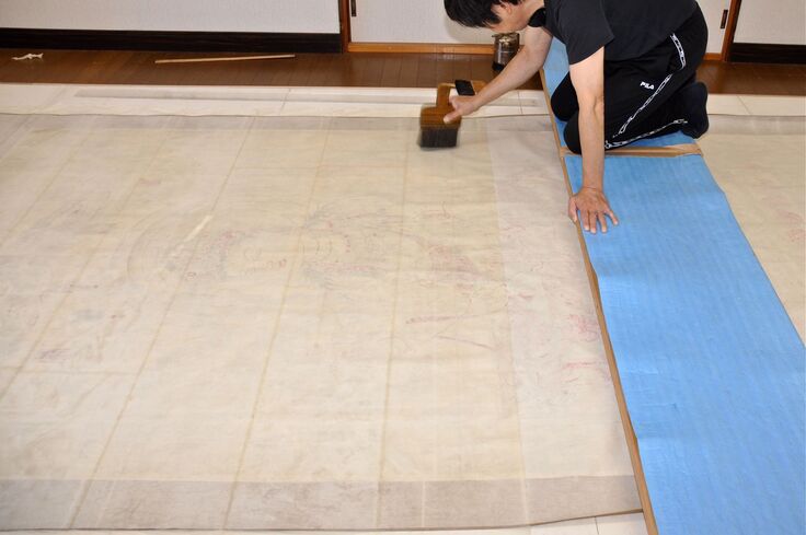 ・総裏打ち後の乾燥(総裏打ちは最終段階の裏打ちのこと。上裏打ちともいう。)