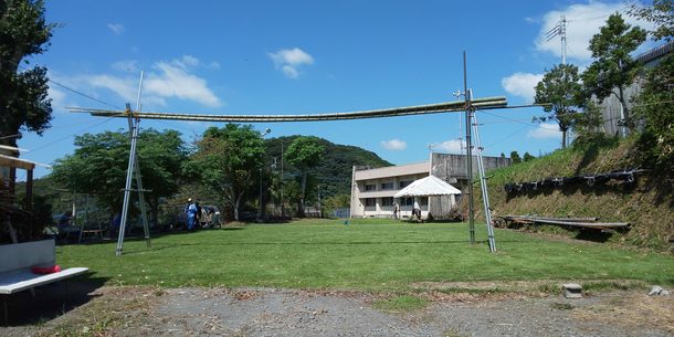 竹の櫓に編んだ綱を引っかけて、編んでは引っ張り、