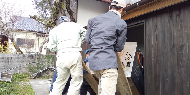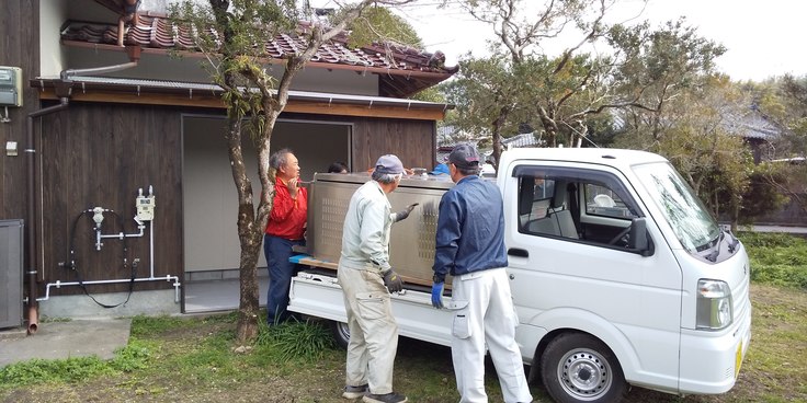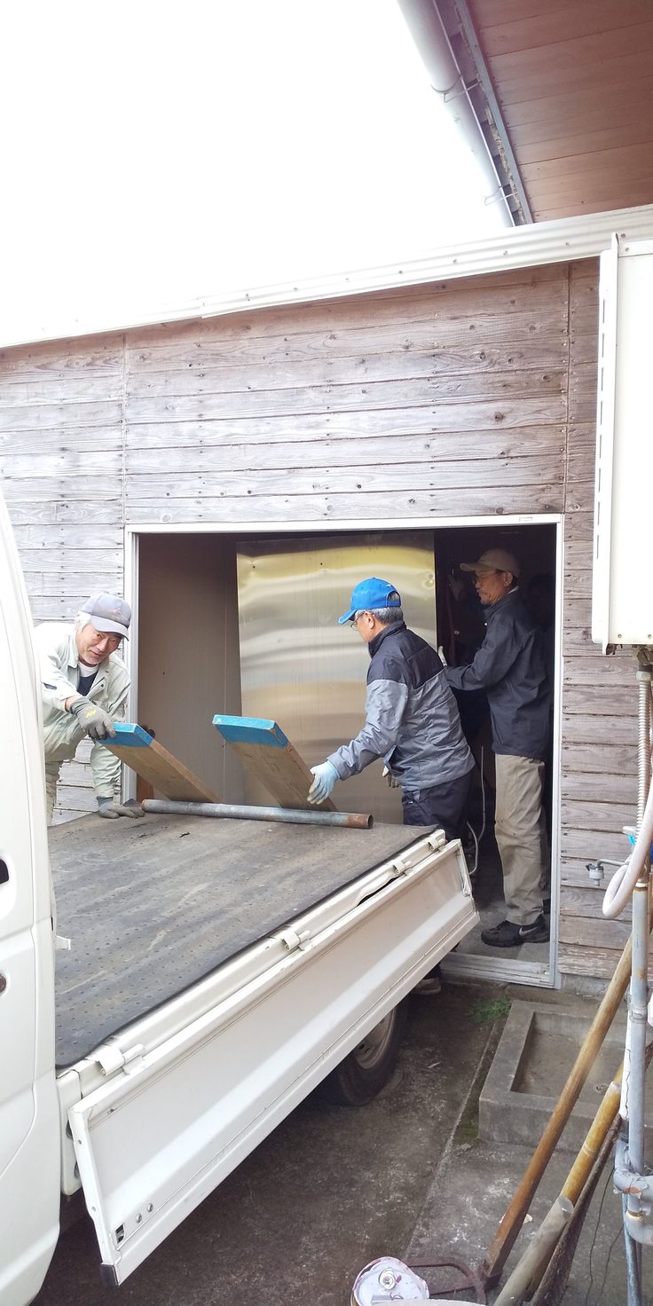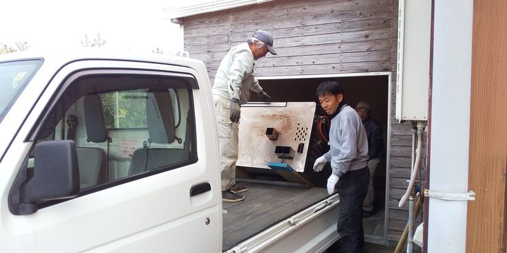 大きな機械を使わず、どうやって軽トラの荷台に乗せるのか。