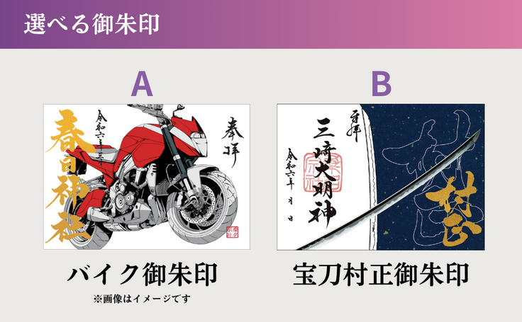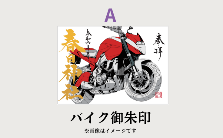 なおバイク御朱印に描かれるのは、SUZUKIの『KATANA』をモデルにしたバイクです。バイカーの方々とのつながりが深く、宝刀村正を有する当社だからこそのバイク御朱印となっております。