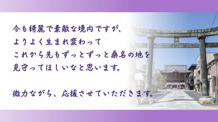 温かい応援コメントを拝読し、この歴史ある神社を未来につなぐことの意義と責務を今一度噛み締めているところです。