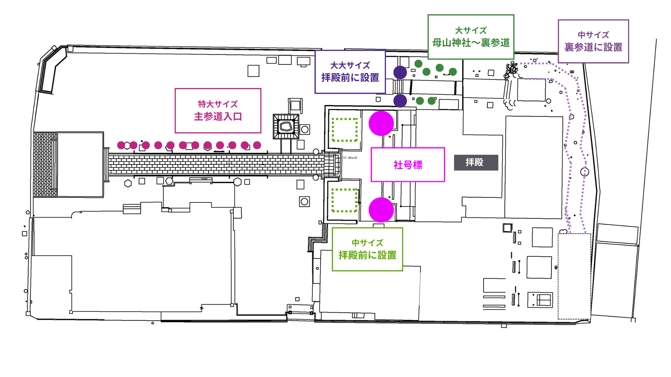 いくつかコースをご用意する中で「実際にどこに設置されるか分かりづらい」というお声をいただきましたので、境内図に実際の内容を書き入れさせていただきました。ぜひこちらもご参照の上、ご支援をご検討いただけますと幸いです。