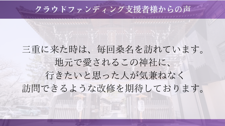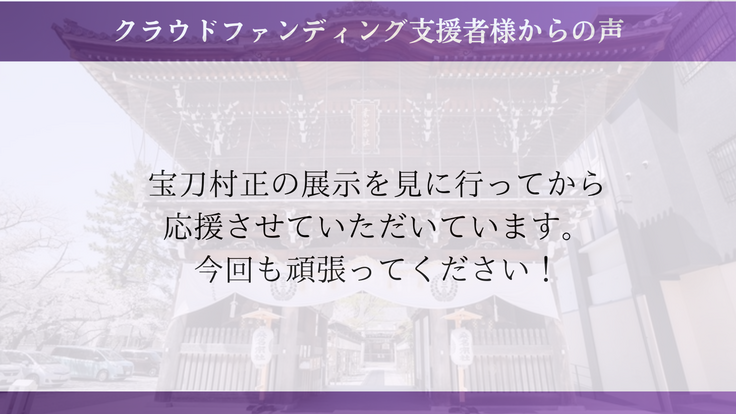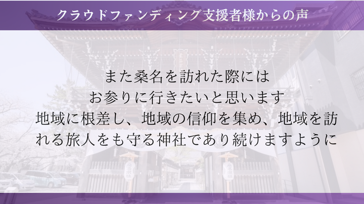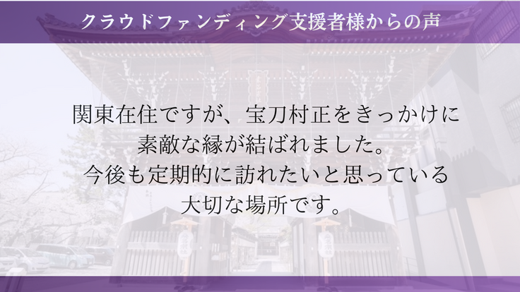 宝刀村正をきっかけにご縁をいただいた方や、地元桑名にお住まいの方など、幅広い方々から応援をいただいてここまで来ることができました。これからも祈りの場を100年先、200年先にも繋いでいけるよう、歩んでまいります。