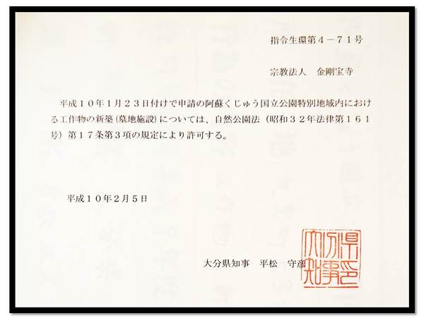 建設場所の金剛宝寺は、しっかりと墓所の許可を取得しています。