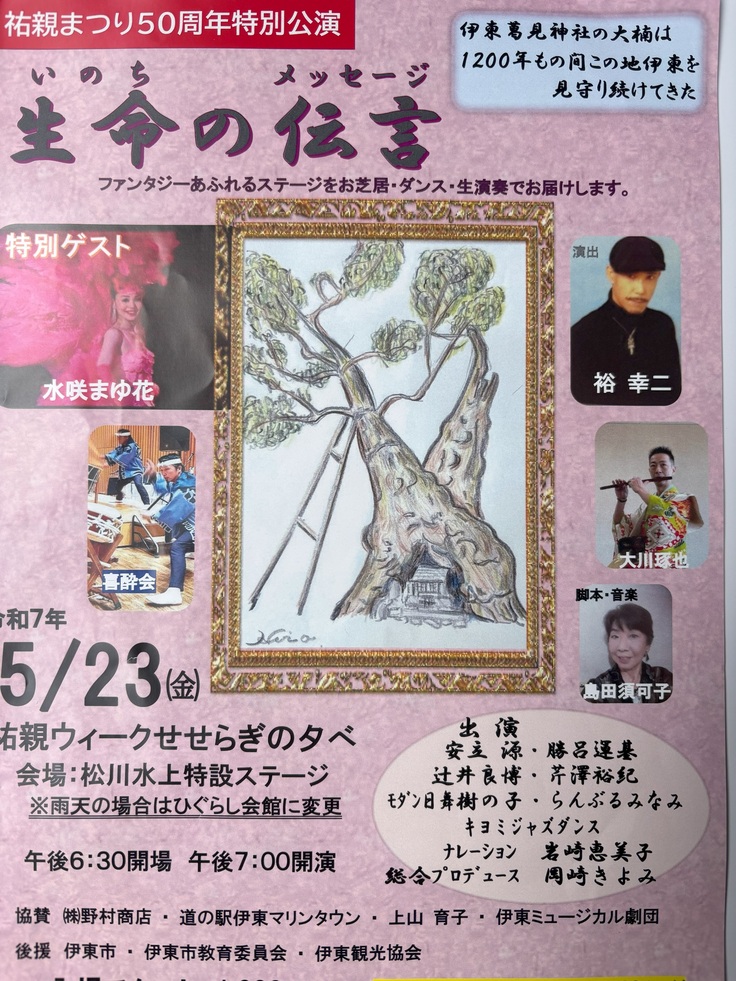 4日目(5月25日)の伊豆新聞に23日に行われた水上舞台の事が掲載されており、今回の舞台の内容が「葛見神社の大樟が見てきた歴史」を紹介する内容に構成されていることが書かれていました。