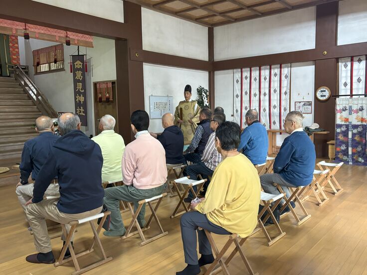 月次祭終了後、宮司がクラウドファンディングの協力を地域の方々に知っていただくために、氏子総代の皆様にチラシの配布を依頼しました。