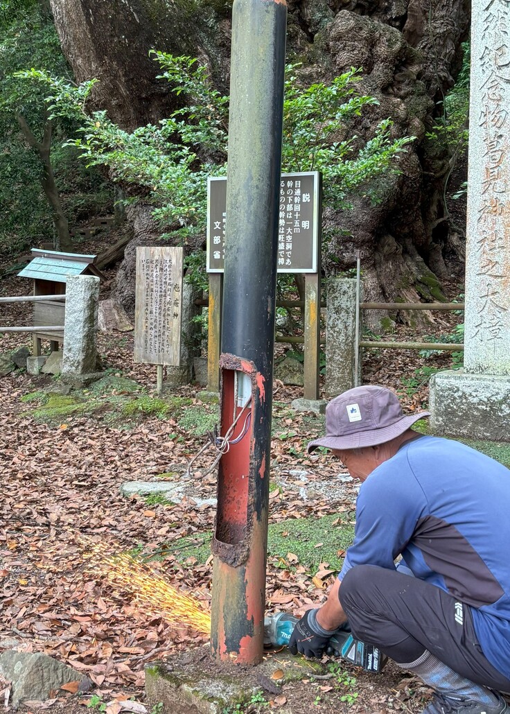 樹勢回復事業の中で、大樟の横にあるタブの木は、大樟への日照を遮ってしまっているため伐採する予定です。そのタブの木の隣に建っている電源の切れている使用されていない電灯は作業の妨げになるので撤去しなければならず、6月8日に氏子総代の栗原信行さんが取り除いて下さいました。