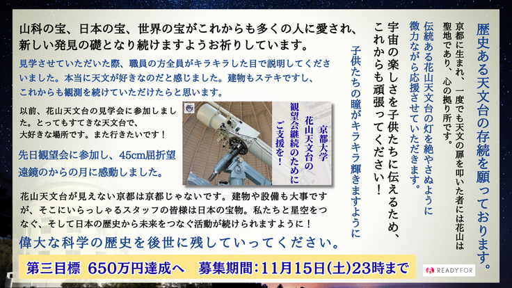 第三目標(650万円)の達成に向けて、多くの方から温かいご支援と応援コメントをお寄せいただき、心より感謝申し上げます。