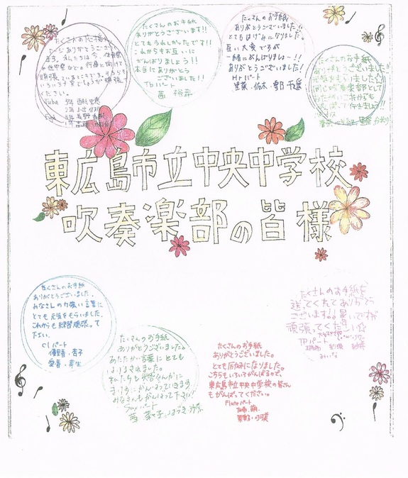 内容は、東広島市立西条中央中学校吹奏楽部の部員から宮城県石巻市の住吉中学校吹奏楽部、渡波中学校吹奏楽部の部員の方へ応援メッセージカードを100枚送付いたしました。