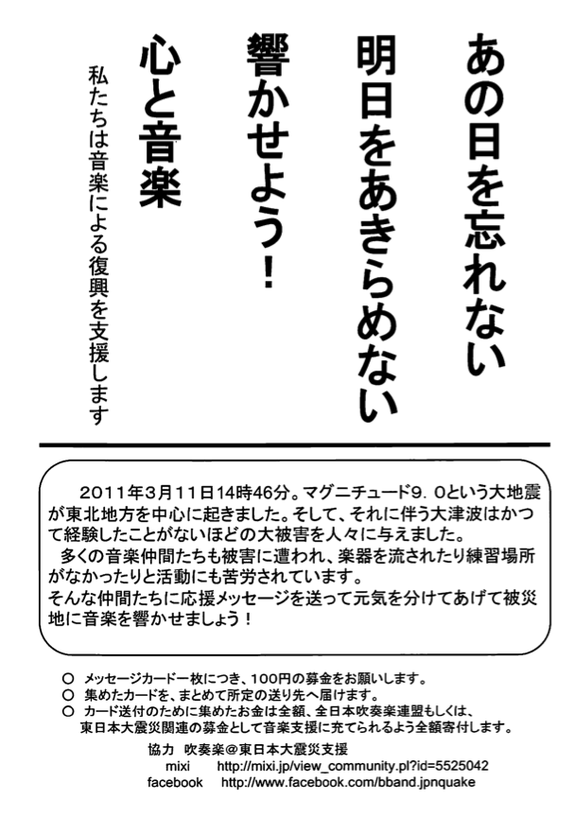 活動にご賛同いただいた西日本にお住まいの方が地元の中学校と、被災地の中学校の吹奏楽部同士による応援メッセージのやりとりを仲介させていただくといった活動を行なってきました。