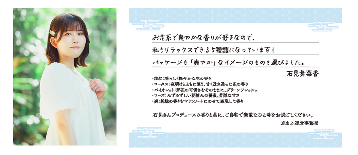 石見さんはお花系の中でも爽やかなリラックスできる香りがお好きだそうで、パッケージも「爽やか」なイメージにこだわってセレクトいただいていました。