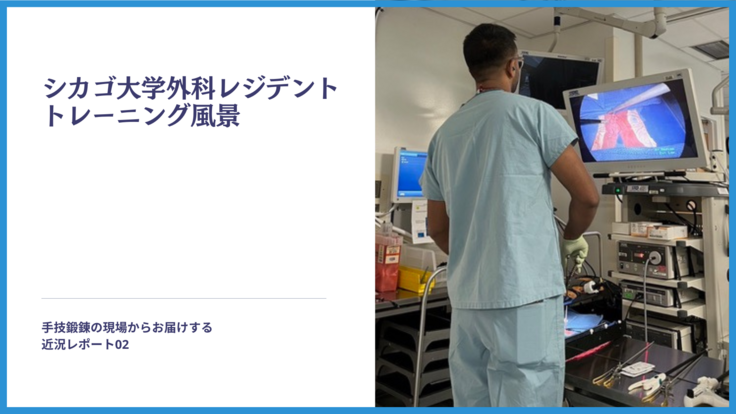 シカゴ大学外科レジデントの練習風景です。腹腔鏡下で豚の小腸を使って腸管吻合の練習をしております。2週間、この環境でひたすら手を動かして、研修終了時には見違えるようなスキルを手にして現場に戻ります。杏林大学も理想を高く、このような練習環境を提供できるよう頑張っていきますので、どうぞよろしくお願いします。