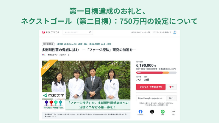 この度、第一目標が達成されたことで、ネクストゴール 750万円を設定することが可能となりました。今後ネクストゴールの到達までにいただくご寄付は、2026年以降にファージカクテルの有効性を多数の臨床分離株を用いて評価するために使用させていただく所存です。