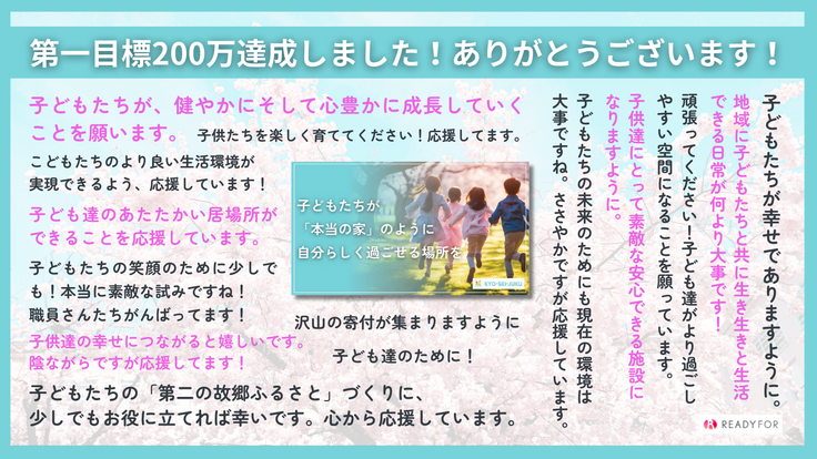 プロジェクト開始直後から、たくさんの方々から温かいご寄付や応援メッセージをいただいたことが、 挑戦への後押しとなりました。皆様の温かいお気持ちに改めて感謝申し上げますとともに、ネクストゴール達成に向けて、職員一同、より一層尽力してまいります。
