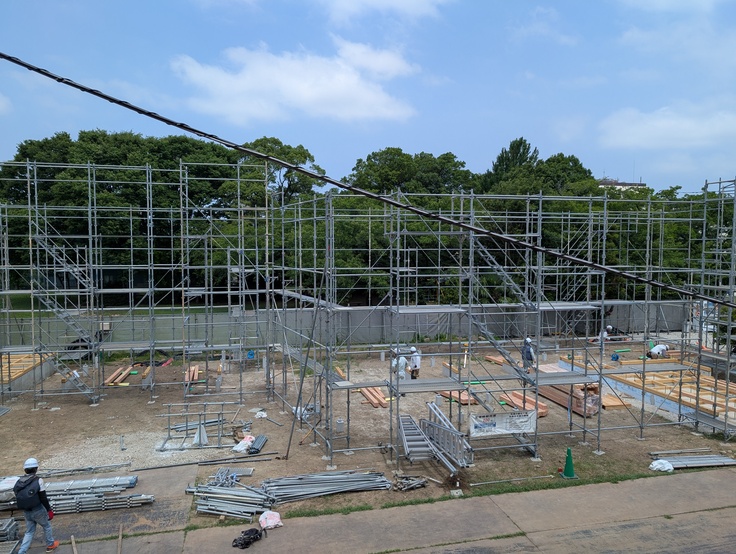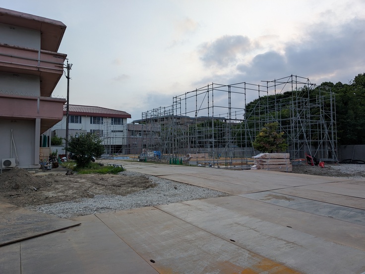 新しいお家の建て替え工事は順調に進んでいます。6月中は基礎工事があり、現在は足場を立ててお家の骨組みを作っていく作業を行い、一般の家庭でいう「上棟式」が7月中に予定されています。