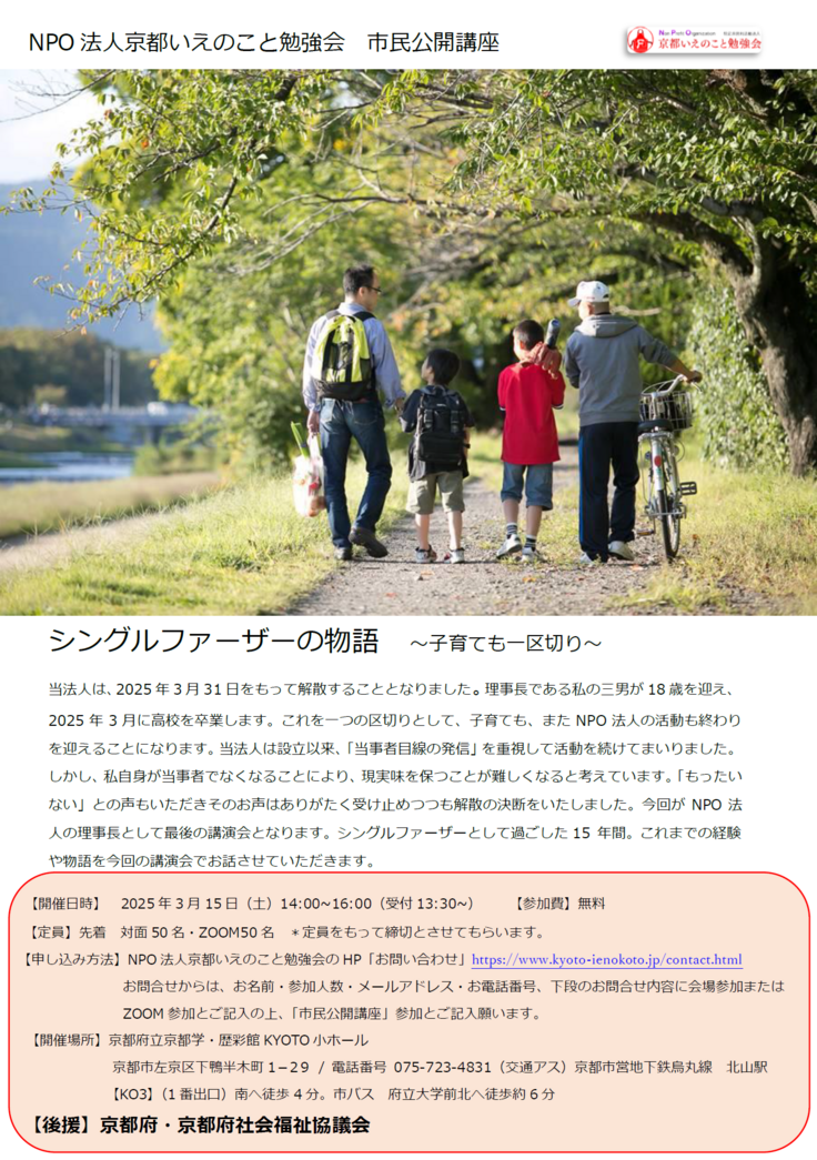 今後、3月15日(土)にNPO法人京都いえのこと勉強会理事長として最後の講演会「市民公開講座」を開催いたします。そして3月31日(金)をもって業務終了になります。その後、解散手続きに入ります。個人とし講演活動は続けますが、父子家庭支援の事業は行いません。今後も父子家庭や遺族に寄り添い、グリーフケアを通じてお役に立てればと思っております。また、2冊目となるエッセー『シングル父さん子育て奮闘記Ⅱ』の出版を予定しています。そして、最終的には映画化を実現し、死別父子家庭の想いや現実を広く発信できる究極の形となることを願っています。映画化が実現した暁には、カンヌ映画祭のレッドカーペットを原作者として歩くことを夢見ています。その夢を必ずや現実のものにしたいと思います。