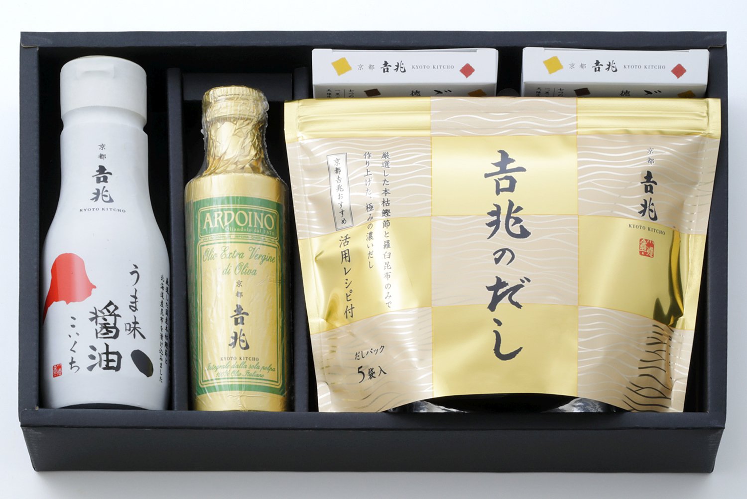 京都𠮷兆オリジナル商品の自信作、𠮷兆のだし・うま味醤油・オリーブオイル・ごま七味の4つをセットでお届けいたします。お子様からご年配の方まで安心してお召しいただける品々です。伝統的な日本料理の味を、手軽にご自宅で味わっていただければ幸いです。