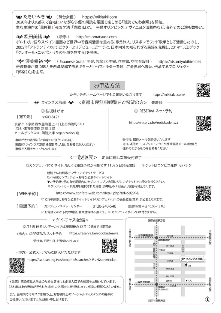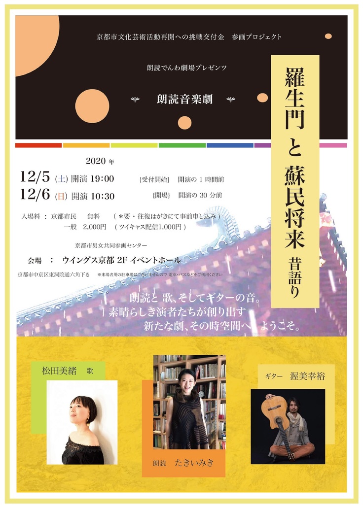 本日は、たきいみきさんの公演「朗読でんわ劇場プレゼンツ『朗読音楽劇~羅生門と蘇民将来昔語り』」について、お知らせします。