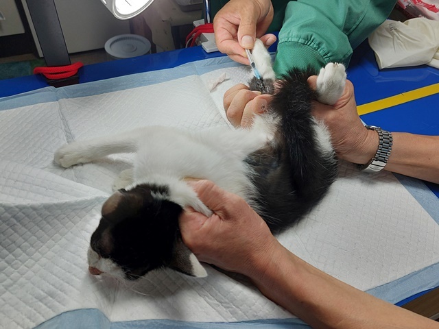 診察の結果、栄養状態はやや不良。寄生虫のチェックやワクチンなど、これから必要な初期医療を少しずつ行っていきます。